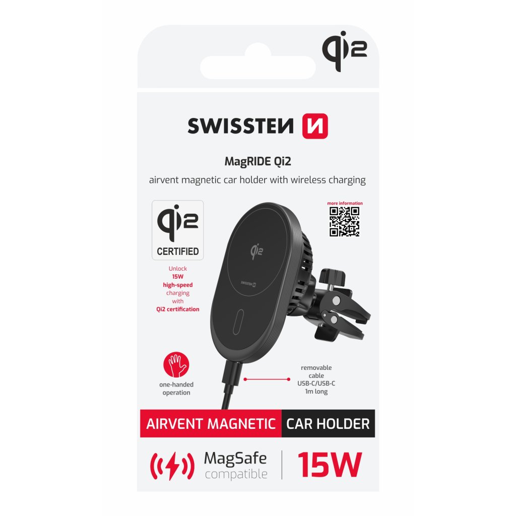 Magnetický držák do ventilace auta Swissten MagRide s bezdrátovým nabíjením Qi2 15 W (MagSafe kompatibilní)