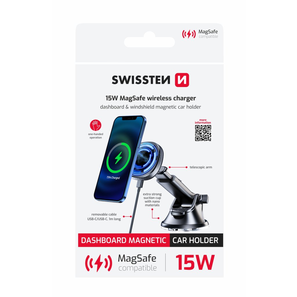Magnetický držák do auta Swissten s bezdrátovým nabíjením 15 W – Dashboard (MagSafe kompatibilní)
