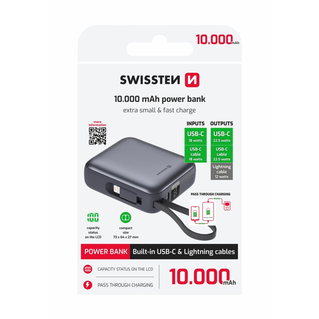 Powerbanka Swissten Space 10 000 mAh s integrovanými kabely USB-C & Lightning – stříbrná