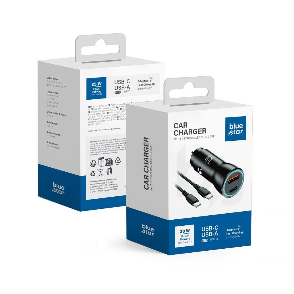 30W nabíječka do auta Blue Star (PD, QC 3.0, AFC, PPS) s konektorem USB C a 60W kabelem USB C-C