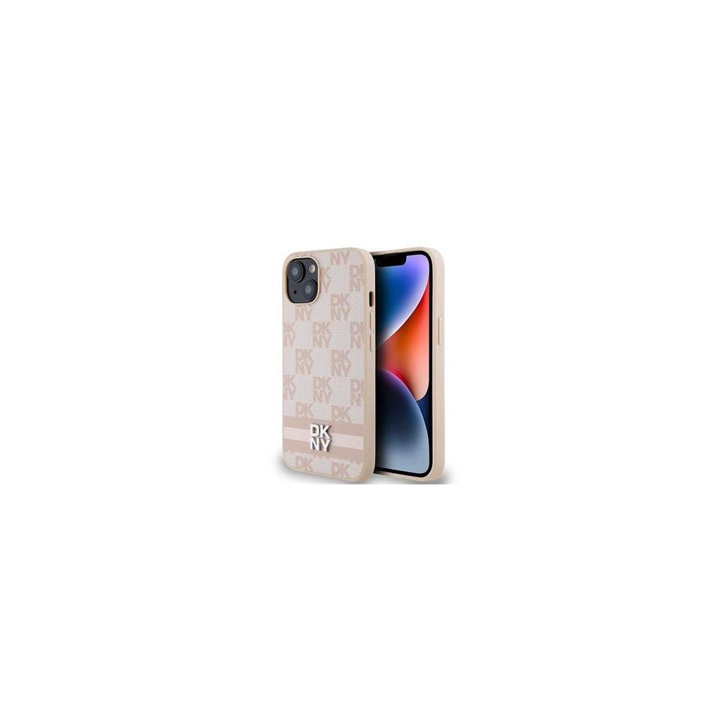 DKNY PU Leather Checkered Pattern and Stripe Zadní Kryt pro iPhone 14 Pink