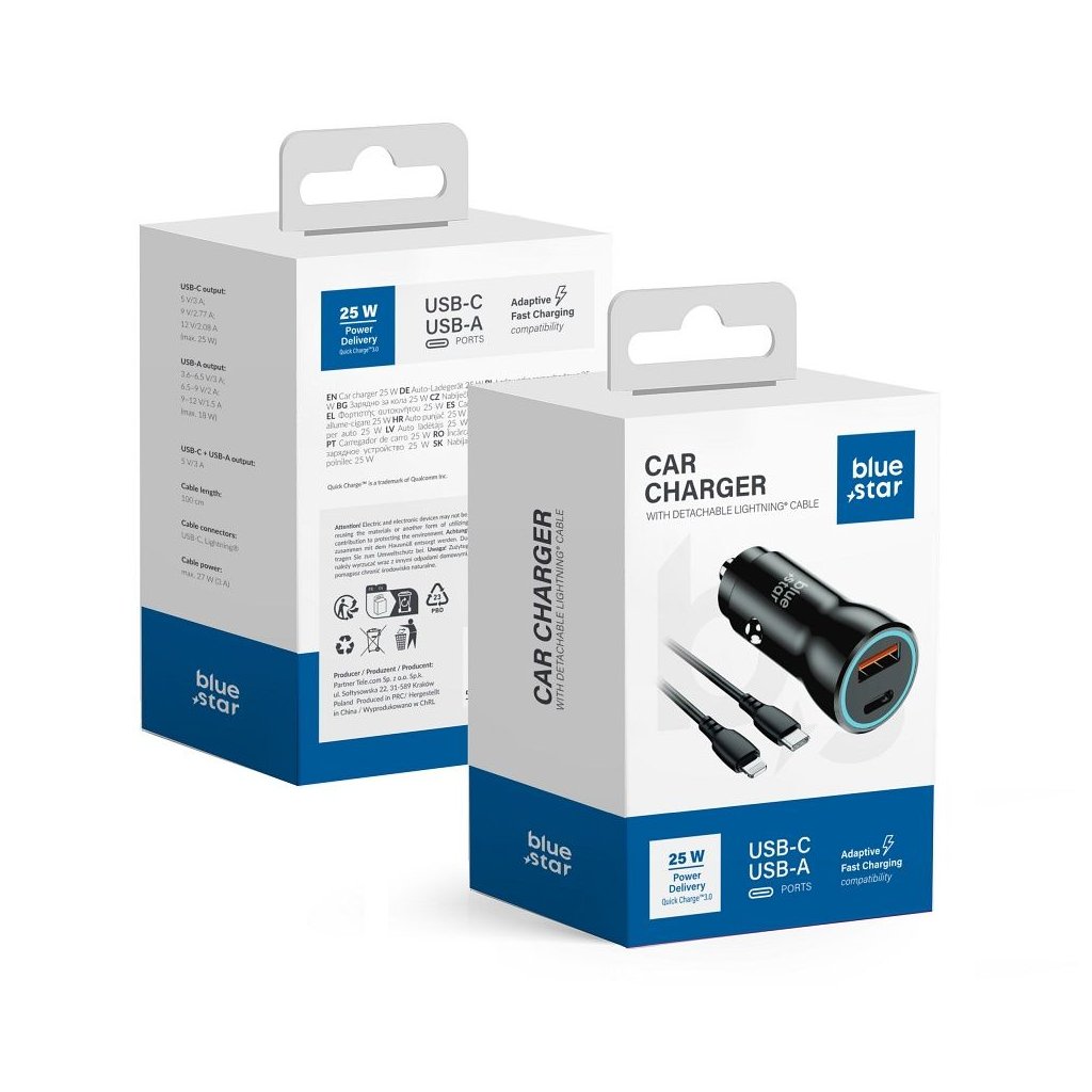Nabíječka do auta Blue Star 25 W (PD, QC 3.0, AFC, PPS) s konektorem USB C a kabelem USB C na Lightning 3A